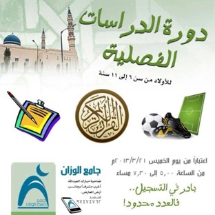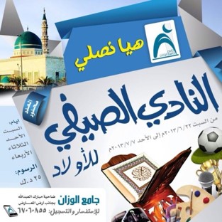 - انعقد النادي الصيفي الأول انعقد في تمام تاريخ 22-6-2013 وحتى 8-7-2013 وكان اجمالي المشتركين 80 مشترك من الصف الأول وحتى الصف السابع، واشتمل على دروس تجويد القرآن، دروس الصلاة، أنشطة رياضية (كرة القدم + السباحة + تنس طاولة + بيبي فوت) ، الأنشطة الترفيهية ( الألعاب الذهنية، الرحلات، مسابقات)