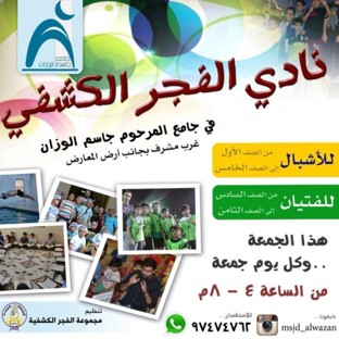 - قرر مجلس ادارة مجموعة كشافة الفجر اقامة النادي الكشفي باسلوب جديد و عصري و جذاب يعمل على تنمية مختلف المهارات للمشتركين من تاريخ 1-10-2013 الى 3-1-2014 واشتمل على عدد من الأنشطة اهمها :- دوري كرة القدم ، رحلات ترفيهية، مسابقات كشفية وثقافية، دروس القرآن الكريم، احياء حفل عيد الغدير، حسينية الأطفال في محرم ، وغيرها من الأنشطة وكان عدد المشاركين في رهط جامع جاسم الوزان 50 مشترك من الصف الأول وحتى الثامن.